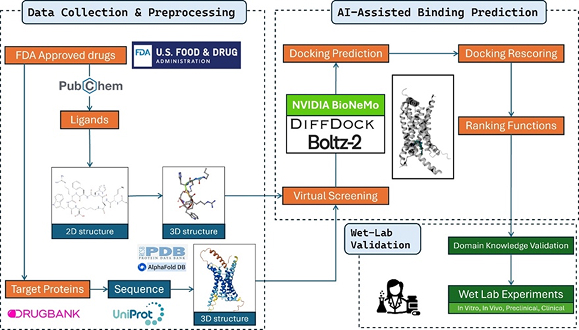 From Drug → Disease through structure-based screening and AI-powered binding prediction for small molecules and proteins.