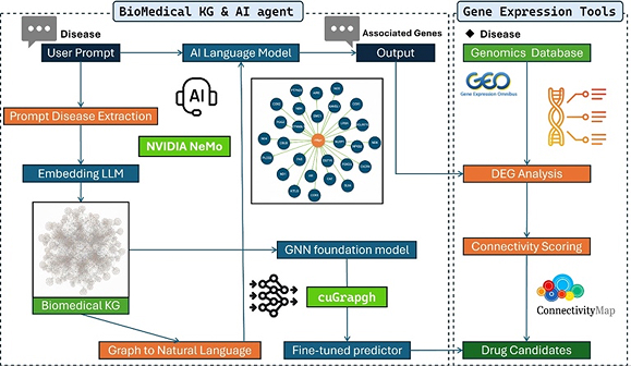 From Disease → Drug via AI agents operating on knowledge graphs and retrieval-augmented generation (RAG), supported by gene expression analysis.